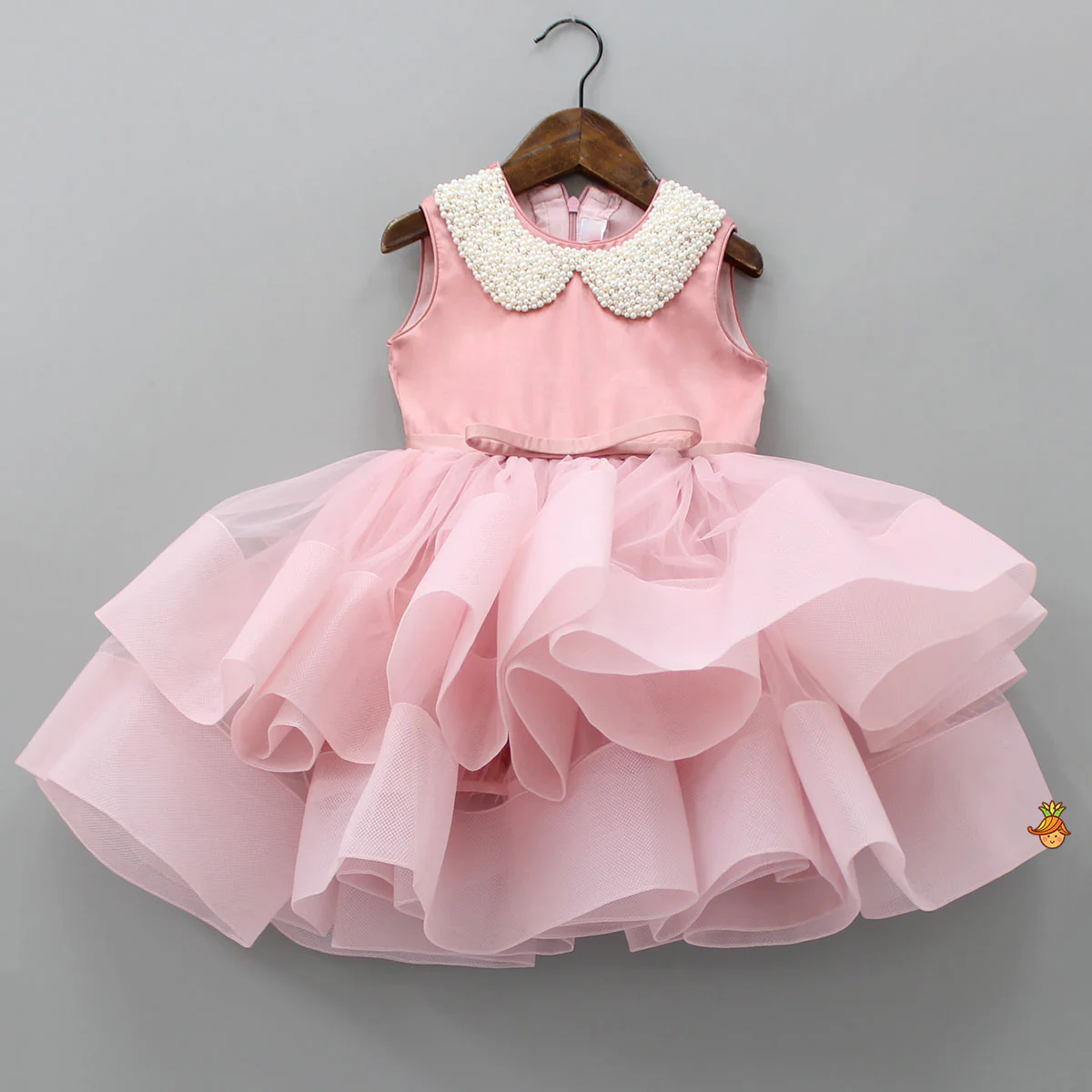 Elegant Pearls Embellished Onion Pink Ruffle Dress With Floral Hair Clip