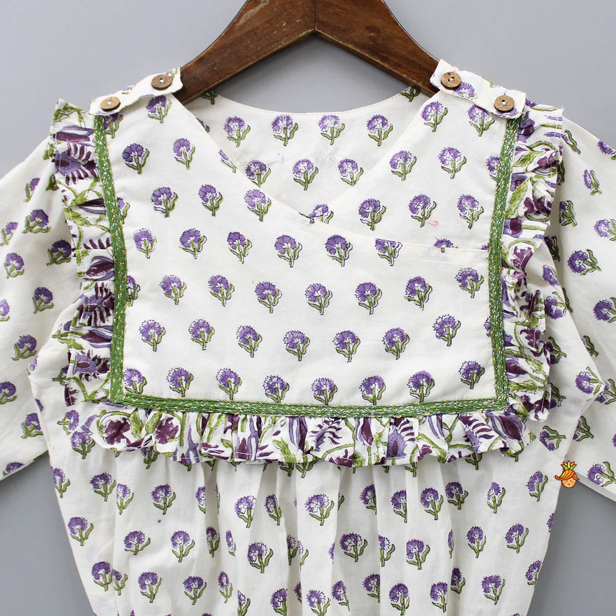 - Back Closure: Buttons on side shoulders