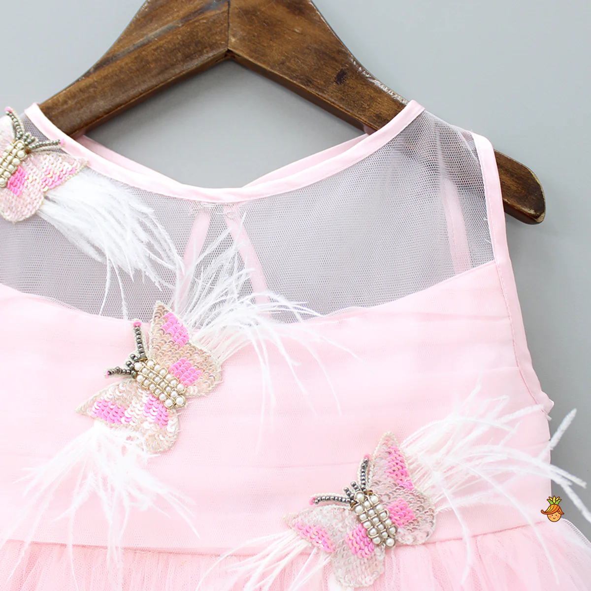 - Sleeveless Net Gown with handmade butterfly embroidery and feathers enhanced at front