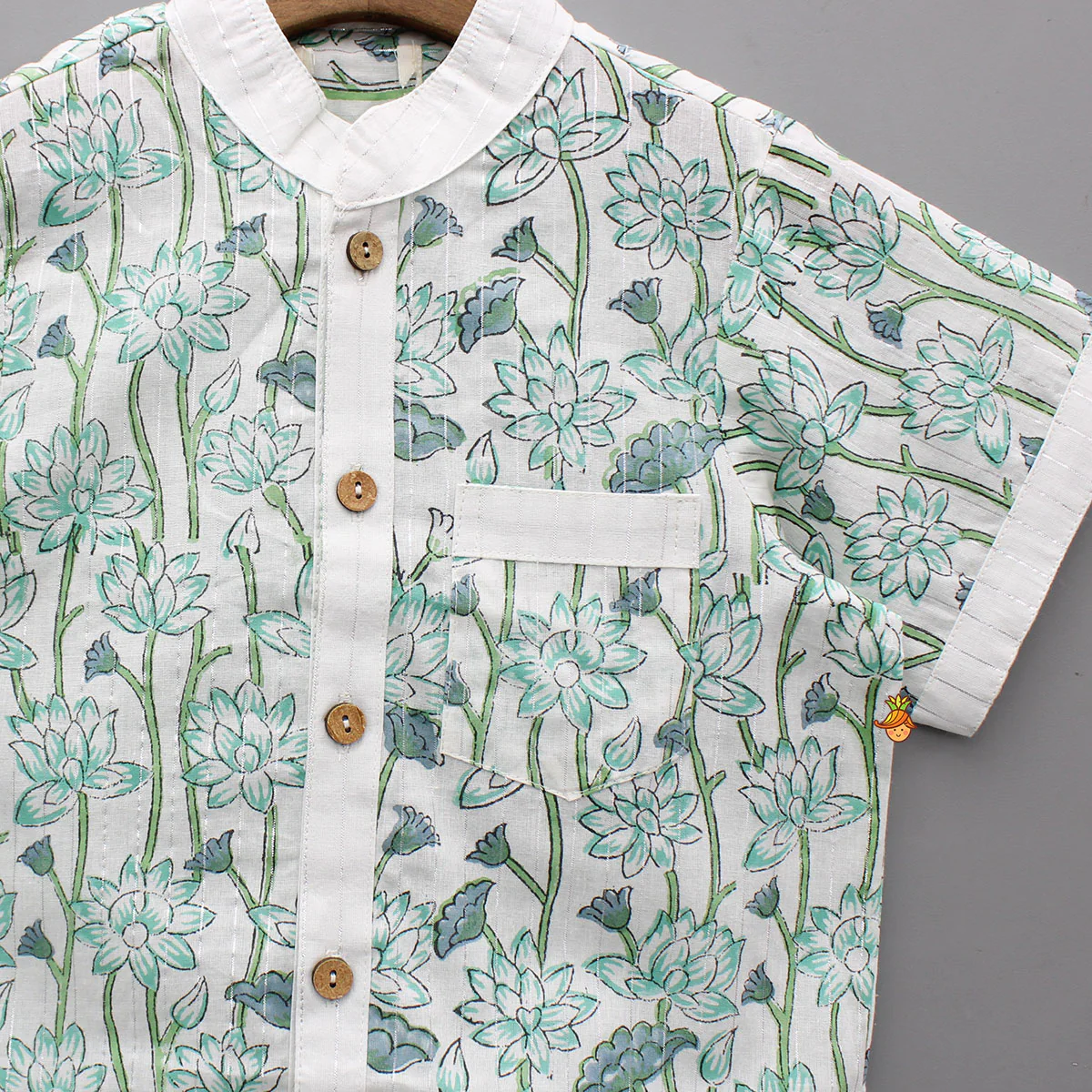 - Short sleeves Shirt with hand block floral prints and lurex stripes on it