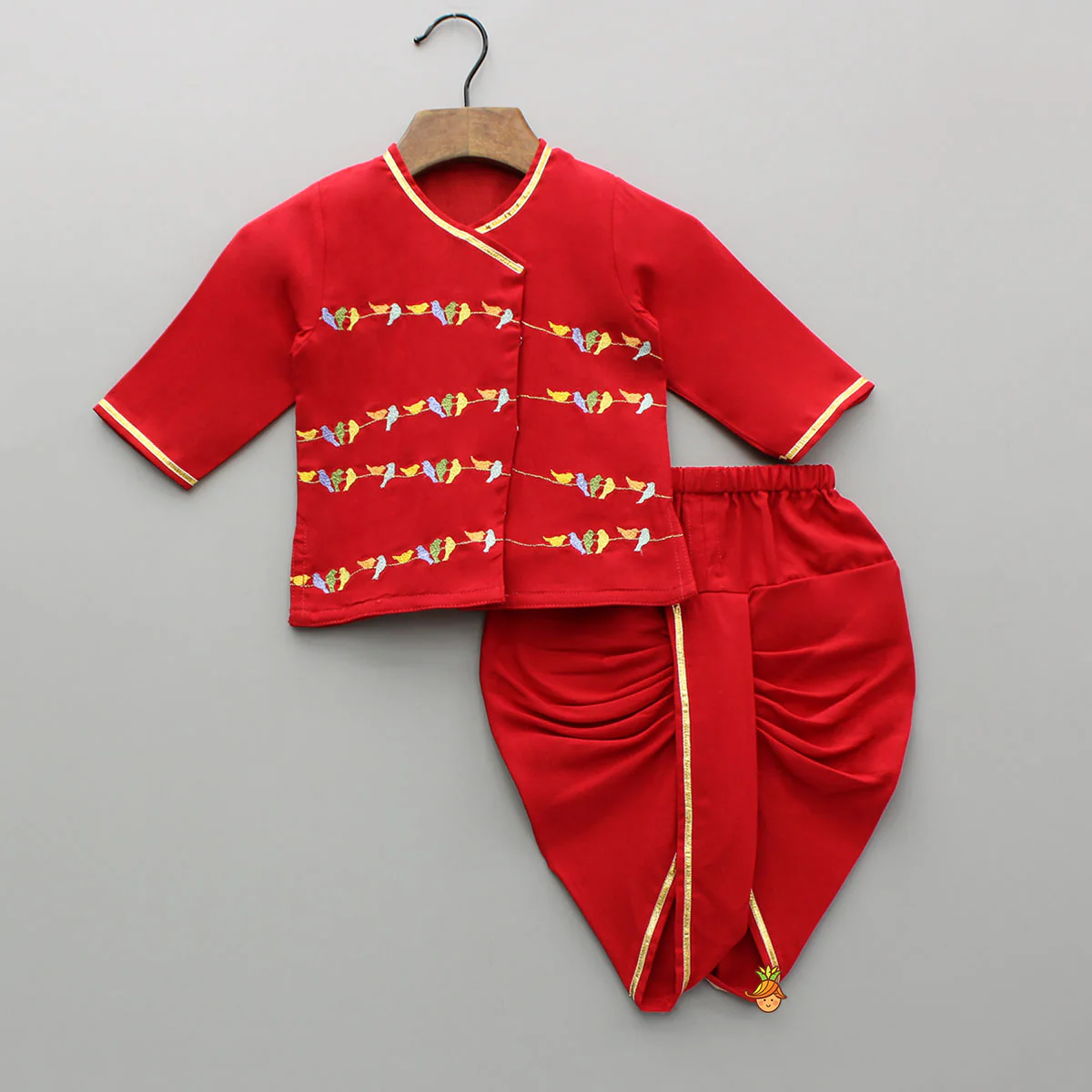 Multicolour Bird Embroidered Kurta And Dhoti With Matching Cap And Booties