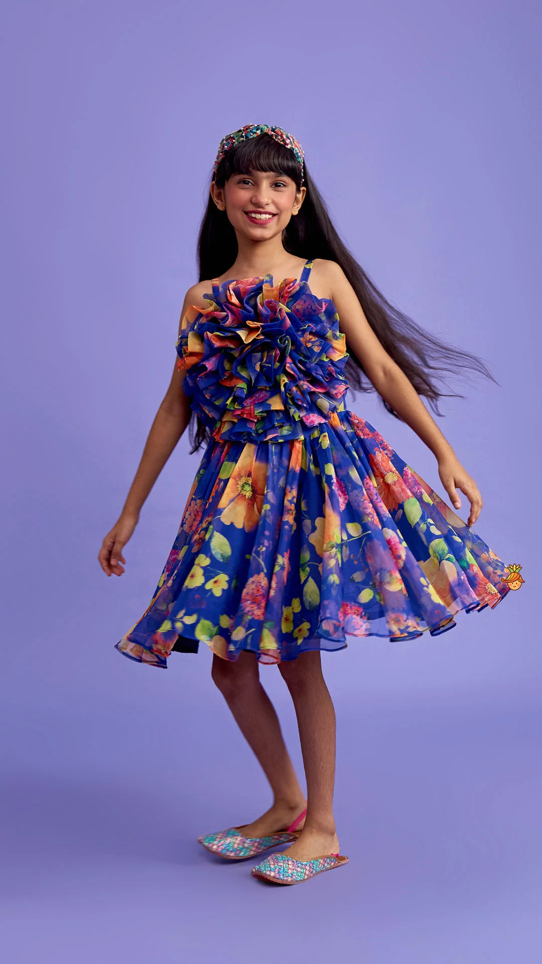 - Dress with floral prints and an organza flower adorned at the front