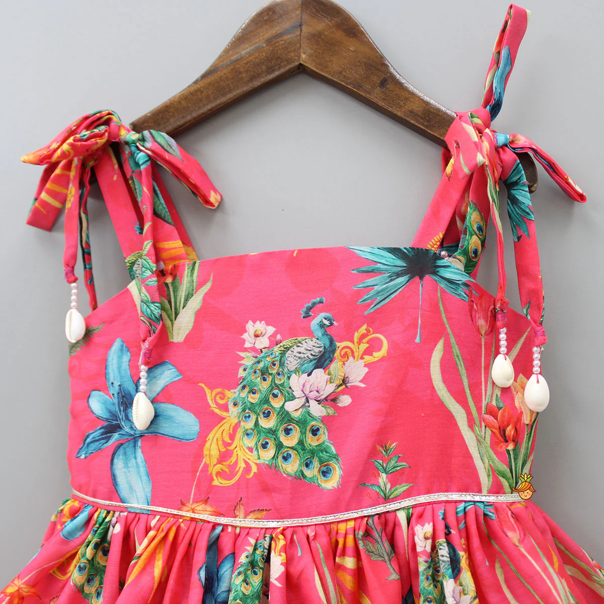 - Dress with leaf, flowers and peacock prints and gota lace detailing on it