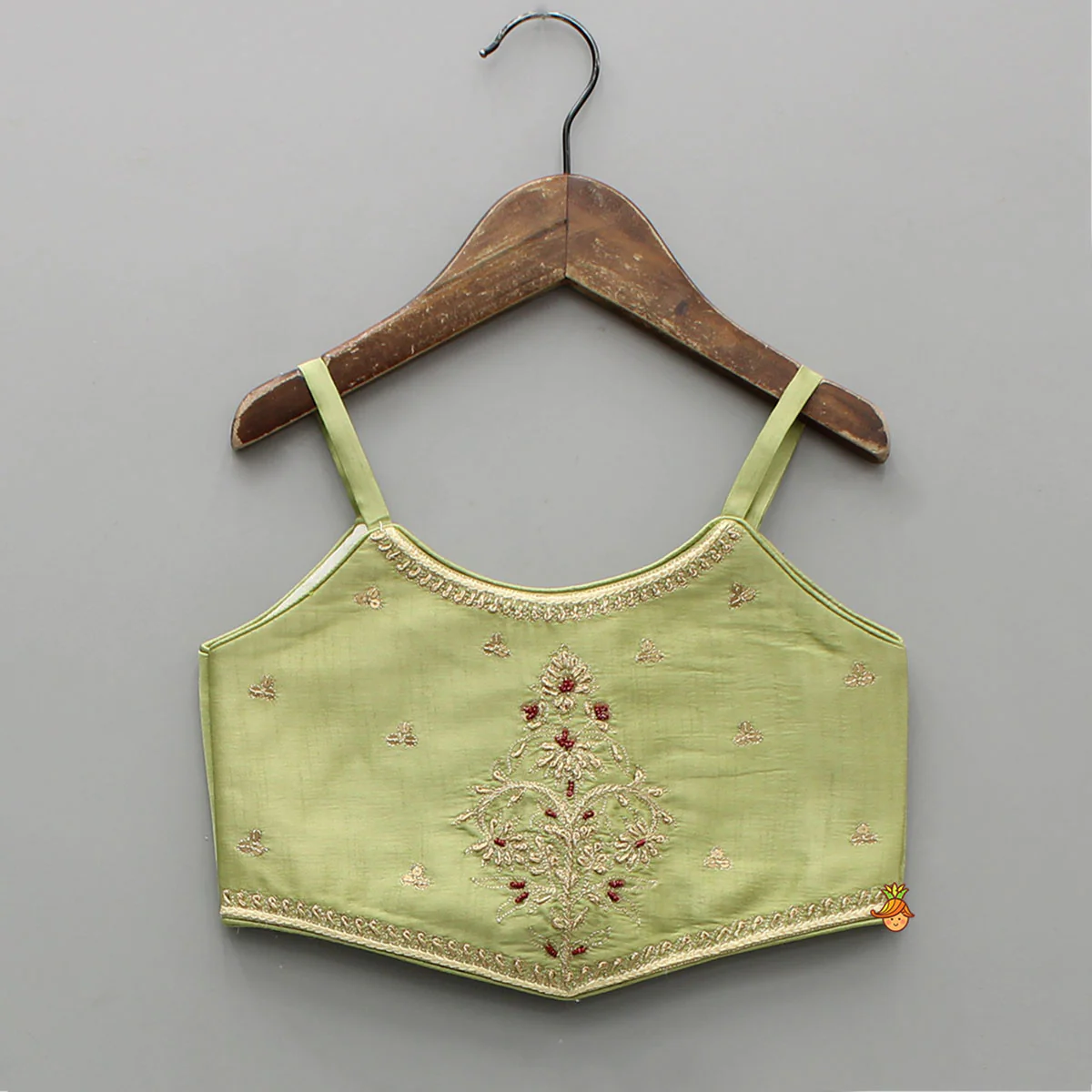 Strappy Green Embroidered Yoke Top And Brocade Lehenga
